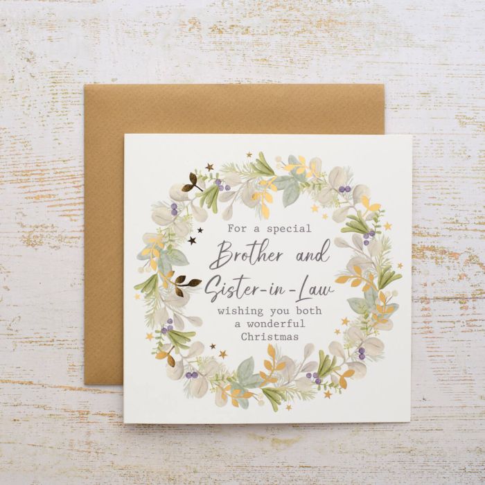 Square paper greeting card with a printed Christmas wreath design in green, gold, cream, and purple, featuring gold foil accents and text reading "For a special Brother and Sister-in-Law wishing you both a wonderful Christmas." Includes a plain brown envelope.