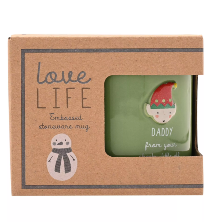 Classic stoneware mug with a 3D embossed elf and with the words 'Daddy from your cheeky little elf'.