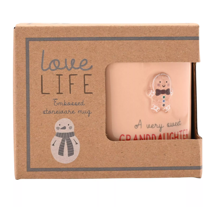 Classic stoneware mug in a pastel pink with a 3D embossed gingerbread and with the words 'A very special Granddaughter'.