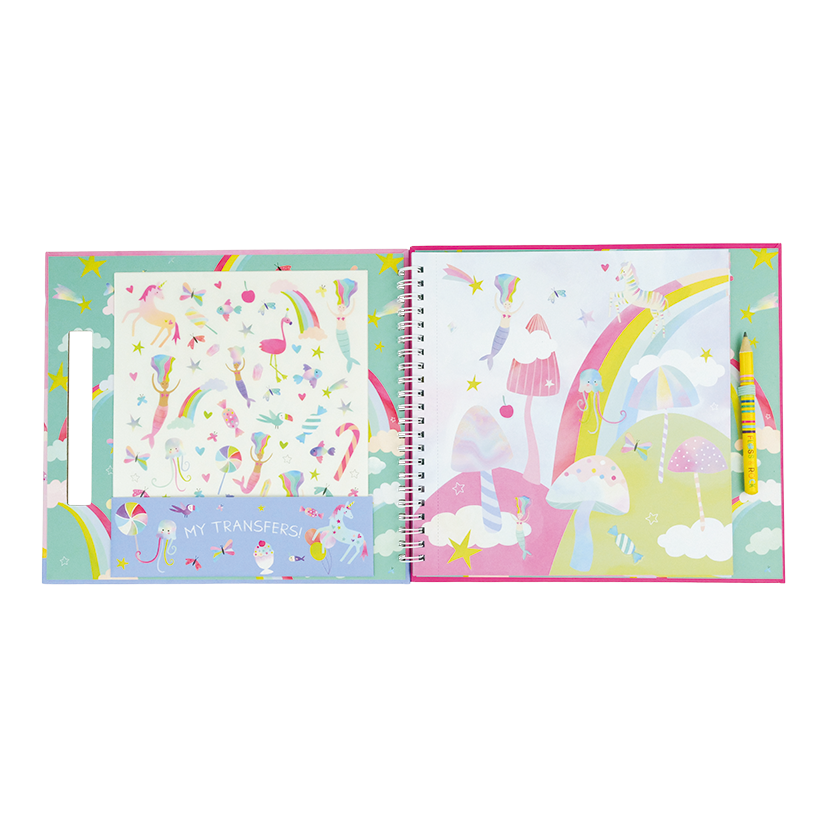 There's so much fun to be had with Transfers! This Fantasy Transfer Fun comes with over 150 fantastic Fantasy themed transfers, 6 colourful scenes to place them onto, 6 plain pages for freestyle doodling and a pencil. Open the spiral bound book to find all your transfers neatly stored in the 'My Transfers' pocket, find your chosen illustration and flick through the pages to find the perfect scene to put them onto. Scratch over the top of the drawing with the Floss & Rock pencil provided and lift up the sheet, like MAGIC you'll find them transferred onto the page. Spend many happy hours sparking creativity and making beautiful pictures with mermaids, unicorns, fun fish and more!