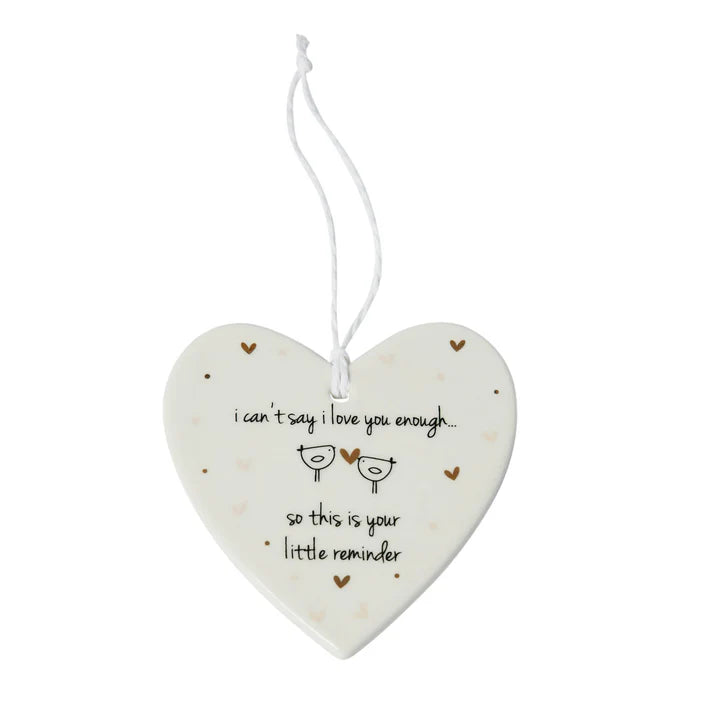 Heart Shaped Hanging Decoration. With beautiful print on white Porcelain with heartfelt message. Delicate Foil Details & cotton twill for hanging.
