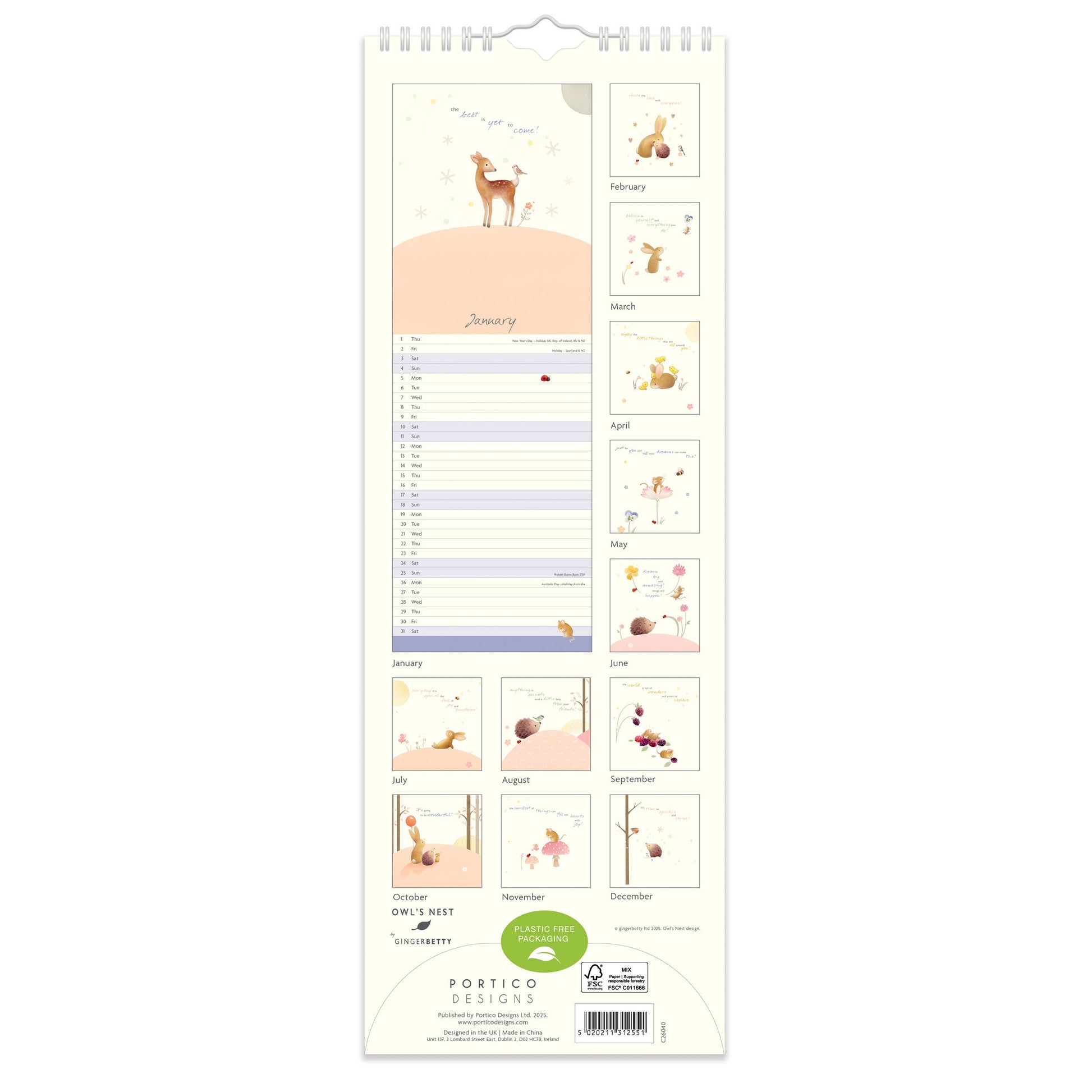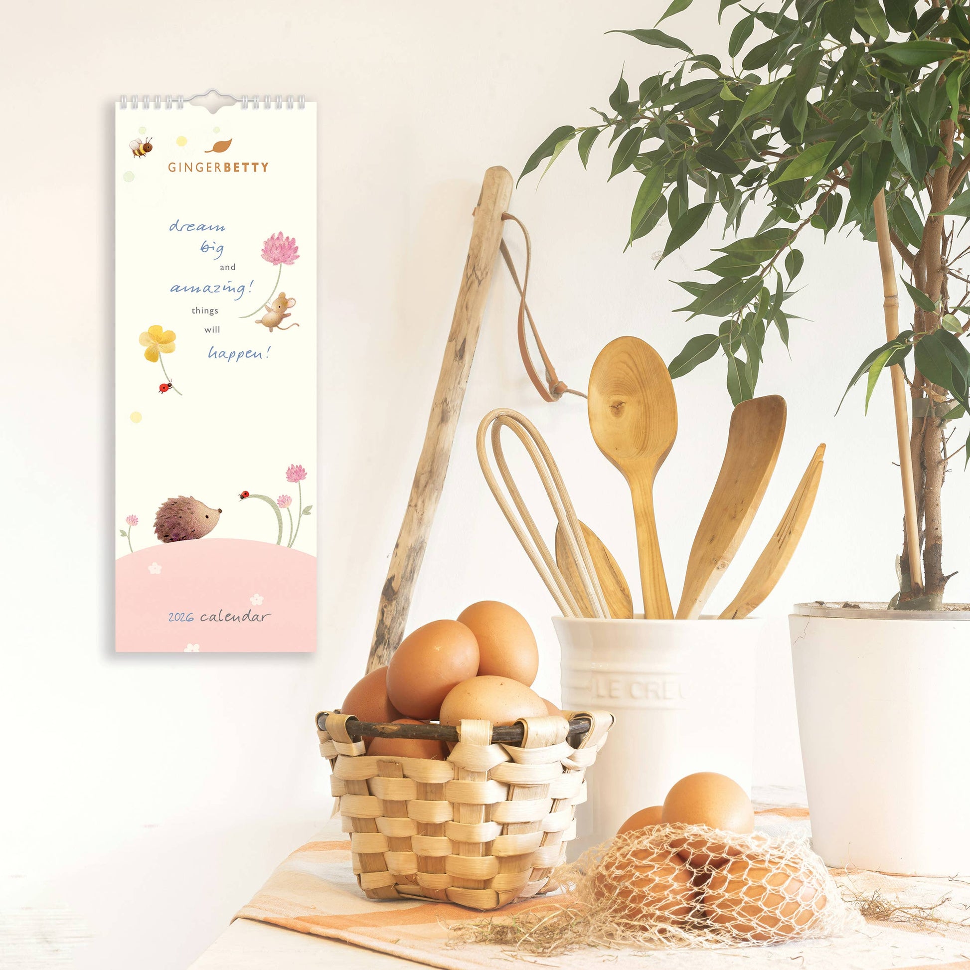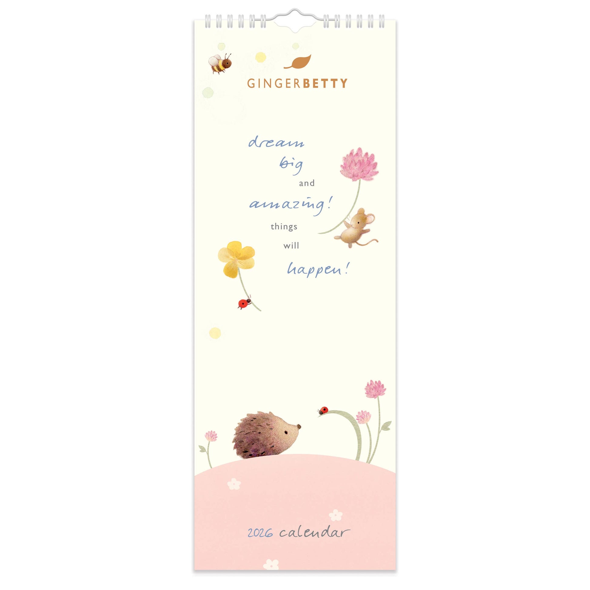 2026 Ginger Betty Slim Calendar from Portico Designs Ltd. Artwork lovingly created by Ginger Better of Owl's Nest design to convey feelings and emotion. Delicate watercolour illustrations with the addition of little words Month to View Layout. Each month includes notes section and next month planner. Includes 2026 and 2027 planners plus list of holidays and important dates.