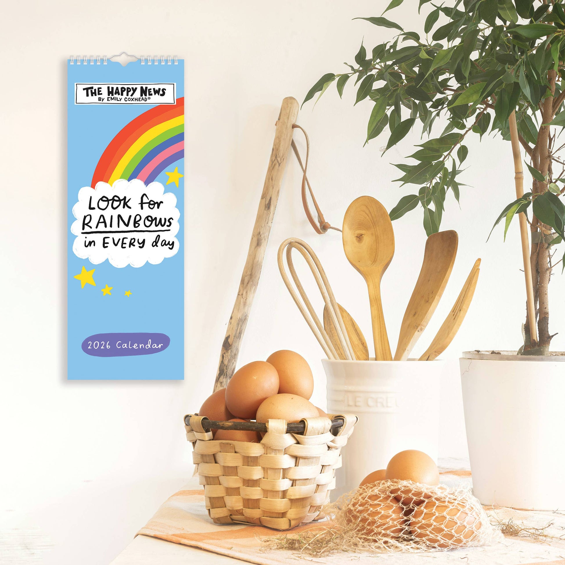 2026 Happy News Slim Calendar from Portico Designs Ltd. Month to View Layout. Each month includes notes section and next month planner. Includes 2026 and 2027 planners plus list of holidays and important dates.