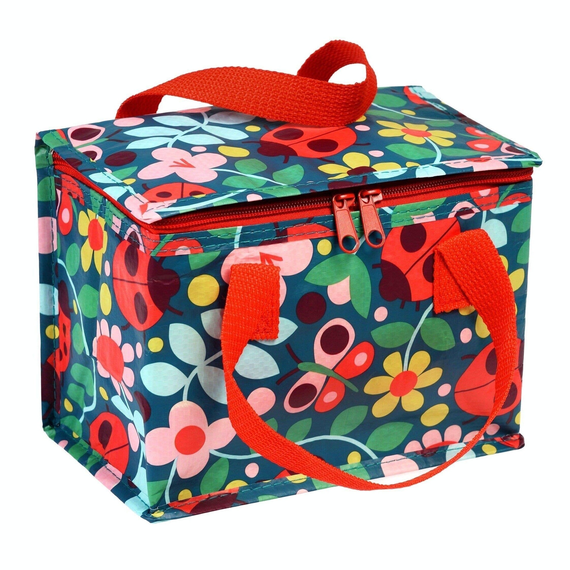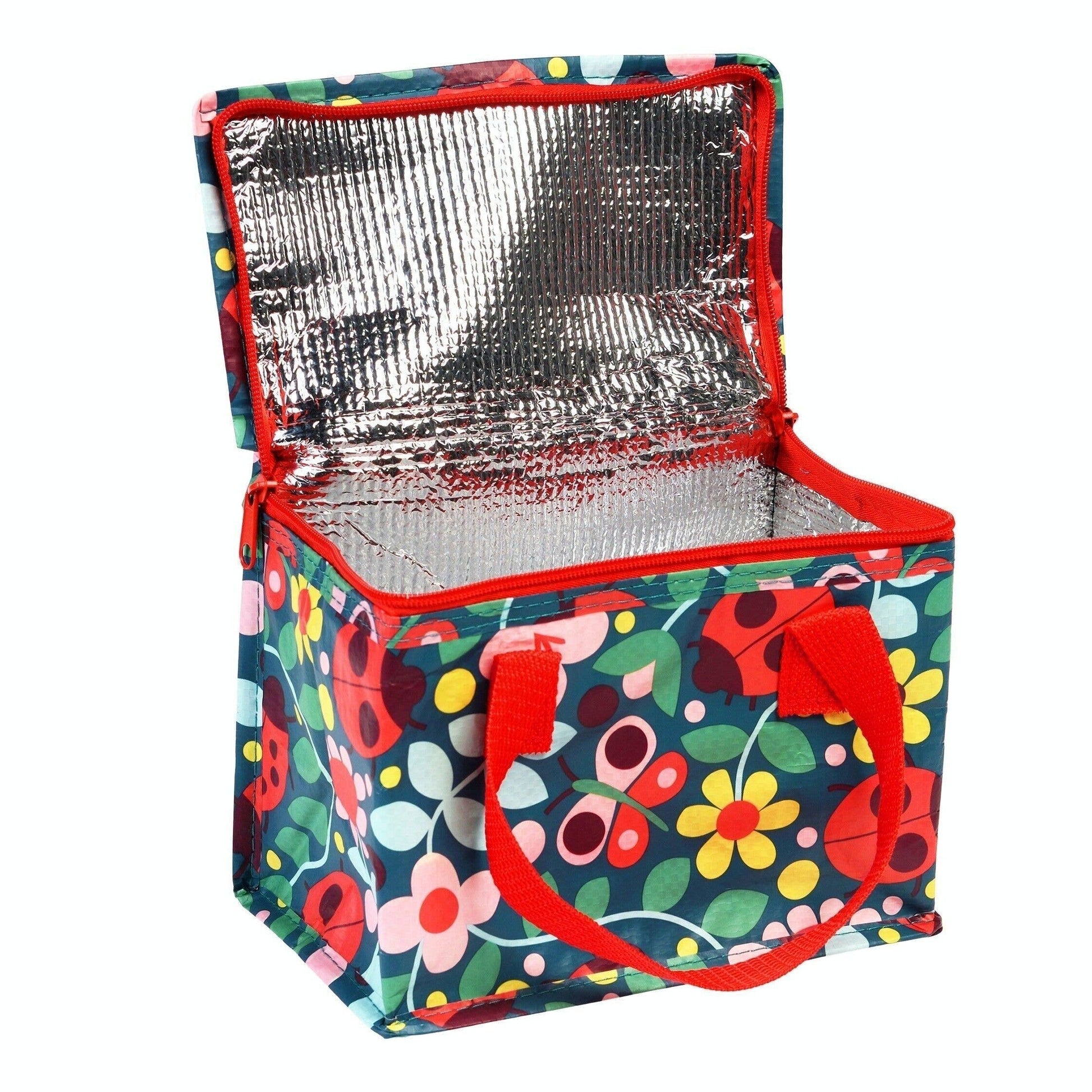 An insulated lunch bag decorated with a ladybird print. • Made from recycled materials (the recycled plastic is equivalent to one average sized plastic bottle) • Foil-lined for insulation • Folds flat for easy storage • Wipe clean with a damp cloth