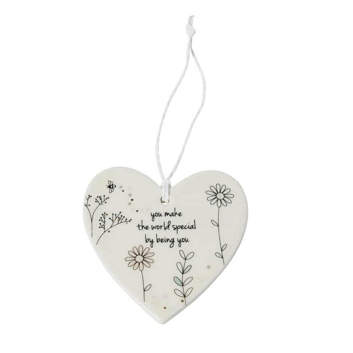 Heart Shaped Hanging Decoration. With beautiful print on white Porcelain with heartfelt message. Delicate Foil Details & cotton twill for hanging.