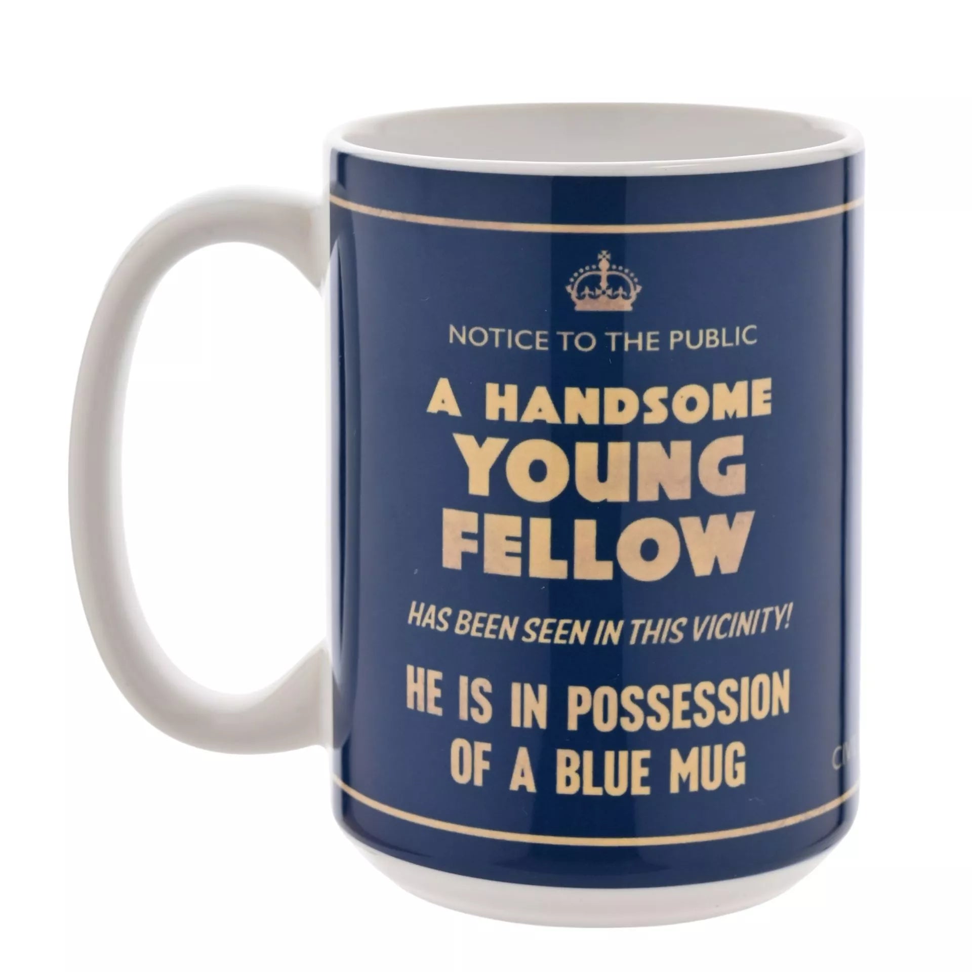 A Civil Defence Tea Allowance Mug 15oz by Harvey Makin®. The mug is made from durable stoneware, has a glazed finish, and boasts a 426ml capacity. This item captures the true essence of 1940s advertisements, but with humour and vintage charm, and offers a playful twist on wartime propaganda. Designed by Jerry Tapscott, the mug includes the comic slogan, ‘A HANDSOME YOUNG FELLOW HAS BEEN SEEN IN THIS VICINITY!’