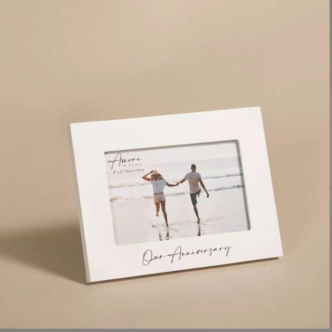 The Amore Photo Frame 6" x 4" – Anniversary is a timeless piece for displaying a cherished memory. The frame features the words "Our Anniversary" and is designed to hold a 6" x 4" photo.