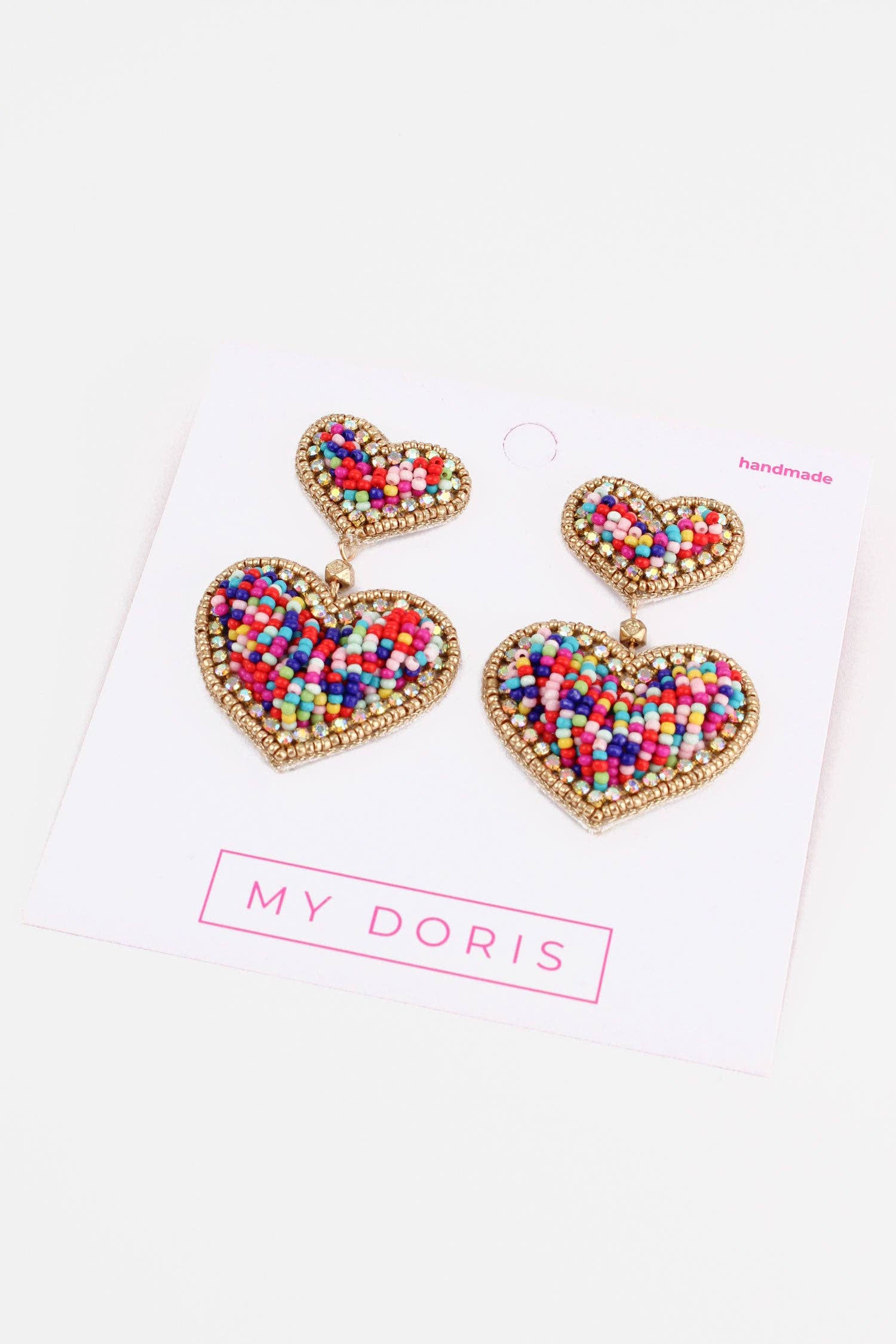Handmade in India by skilled artisans. Approximately 30mm long and 37mm wide with a heart shape earring top - 24mm wide and 20mm tall. Made using glass beads on a lightweight fabric backing.
