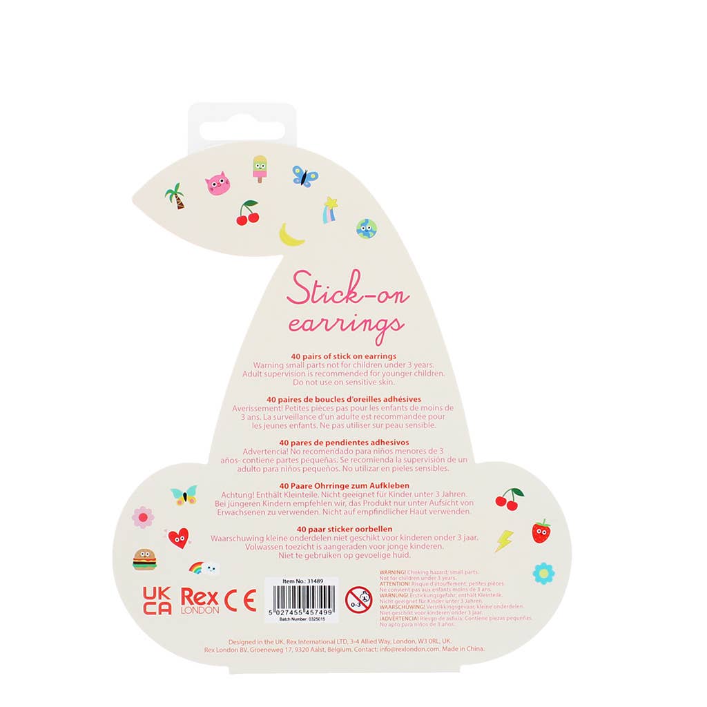 40 pairs of stick on earrings for children in a set. The set features a wide array of cute and fun things, including fruits, ice creams and other foods; butterflies, cats and bunny rabbits; stars, hearts and more.