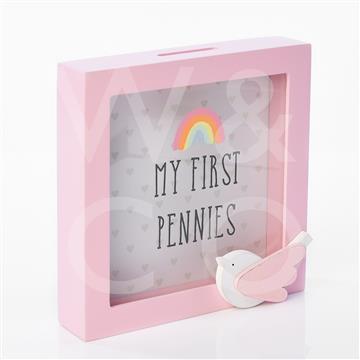 Details: - 'MY FIRST PENNIES' title - MDF and glass - 14.5 x 14.5cm - Pink and white bird - Money slot at the top - Colourful rainbow print above title