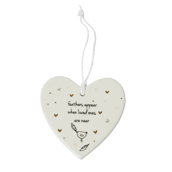 Heart Shaped Hanging Decoration. With beautiful print on white Porcelain with heartfelt message. Delicate Foil Details & cotton twill for hanging.